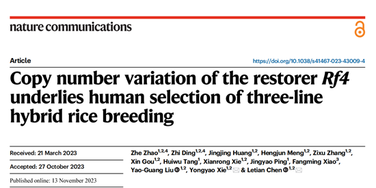 11月14日,乐竞在线注册亚热带农业生物资源保护与利用国家重点实验室、生命科学学院陈乐天/谢勇尧课题组在Nature Communications(影响因子16.6)在线发表了题为Copy number variation of the restorer Rf4 underlies human selection of three-line hybrid rice breeding的研究论文。该论文阐明了Rf4座位在稻属起源、进化和拷贝数变异的规律,揭示了三系杂交稻应用过程中,CMS-WA/Rf4系统人工选育的分子基础,为培育强恢复系提供了新思路,为我国杂交稻的可持续发展提供了理论基础。