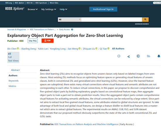 近日,乐竞在线注册电子工程学院(人工智能学院)国家精准农业航空施药技术国际联合研究中心兰玉彬教授团队在人工智能顶级期刊IEEE Transactions on Pattern Analysis and Machine Intelligence(TPAMI,中科院一区,影响因子24.31)在线发表了题为“Explanatory Object Part Aggregation for Zero-Shot Learning”的研究论文(论文链接:https://ieeexplore.ieee.org/document/10287616)。本论文提出一种零样本识别方法(ZSL),旨在识别未在训练样本中出现过的不可见类目标。