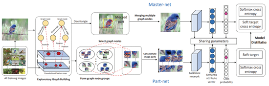 传统的零样本识别方法大都专注于优化特征空间或生成不可见类的虚拟视觉特征,存在大量使视觉特征和语义属性不匹配的虚拟连接,降低了识别性能。本论文提出基于类激活特征构建可解释图的方法,全面挖掘细粒度的目标区域,提升深度网络预测结果。基于该方法下,聚合后的目标区域包含可全面激活语义属性的丰富视觉特征,可以在很大程度上减少虚拟连接的影响。同时该论文设计了一个新型特征蒸馏网络,将局部特征蒸馏到全局网络中,进一步识别精度。在AWA2、CUB、FLO和SUN数据集上的实验结果表明,该论文提出的方法在传统的ZSL和GZSL任务中均大幅度超越了现有技术。
