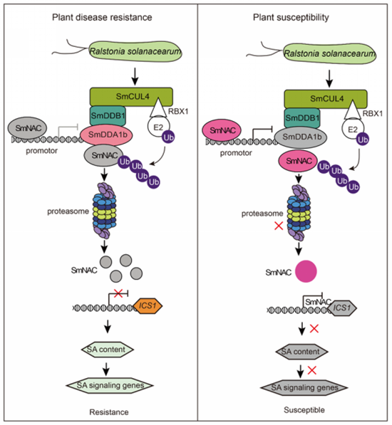 该研究发现E3泛素连接酶SmDDA1b在抗病材料中受到青枯菌和外援水杨酸的诱导表达。VIGS诱导的SmDDA1b基因沉默抑制了茄子的青枯病抗性;SmDDA1b过表达增强了番茄植株对青枯病的抗性。青枯菌含量测定发现SmDDA1b通过抑制青枯菌在植株内的传播来正向调节青枯病抗性。SmDDA1b沉默植株的SA含量、SA生物合成基因ICS1和信号通路基因表达均降低,而在过表达植株的则升高。此外,泛素/26S蛋白酶体系统的衔接子SmDDB1蛋白与骨架蛋白SmCUL4和底物受体SmDDA1b相互作用。蛋白质降解实验表明SmDDA1b通过蛋白酶体降解降低SmNAC蛋白水平。此外,SmNAC可以直接结合SmDDA1b启动子并抑制其转录。因此,SmDDA1b通过SmNAC介导的水杨酸途径在茄类作物抗青枯病中起重要作用。这些结果还揭示了SmDDA1b和SmNAC之间的负反馈回路调控青枯病抗性。