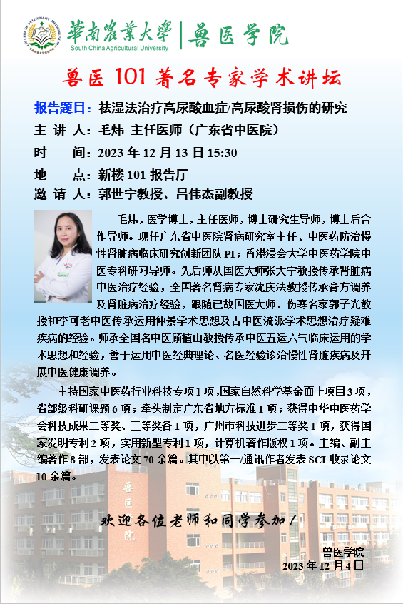 兽医101著名专家学术讲坛--祛湿法治疗高尿酸血症/高尿酸肾损伤的研究