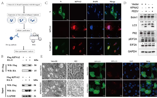 PEDV的结构蛋白在病毒入侵、释放、复制、组装、出芽和宿主免疫调节中起着关键作用,与其它病毒相似,PEDV主要依赖于宿主细胞进行复制。该研究在绘制PEDV结构蛋白与宿主因子相互作用的图谱时发现KPNA2具有抑制PEDV复制的作用。通过质谱技术筛选到与病毒E蛋白互作的宿主蛋白KPNA2,检测到PEDV感染的细胞中KPNA2表达上调(图A和B)。同时,发现KPNA2在PEDV感染后出核至胞质(图C),与E蛋白结合,通过自噬降解E蛋白实现对病毒复制的抑制(图D和E)。