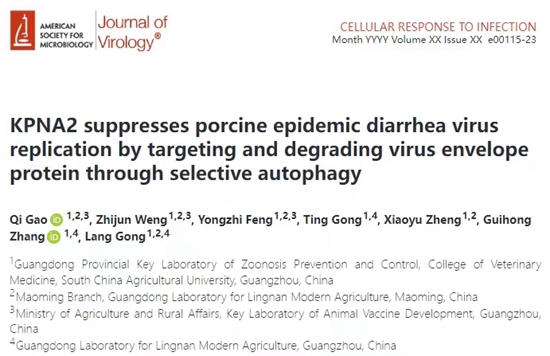 近日,乐竞在线注册兽医学院重大动物疫病防控团队张桂红/龚浪课题组在病毒学权威期刊Journal of Virology在线发表了题为“KPNA2 suppresses porcine epidemic diarrhea virus replication by targeting and degrading virus envelope protein through selective autophagy”的研究性论文(https://journals.asm.org/eprint/FEJ3BRSNDIMBFH3YSQUC/full),发现宿主KPNA2通过自噬靶向降解猪流行性腹泻病毒(PEDV) E蛋白从而抑制病毒的复制。该研究提出了KPNA2 抑制PEDV复制的潜在靶点,可为开发新型抗病毒药物和防控PEDV感染提供新策略。