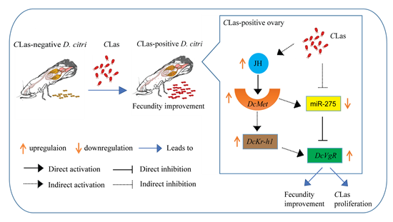 miR-275靶向DcVgR参与黄龙病菌提高柑橘木虱生殖力的分子模式图
