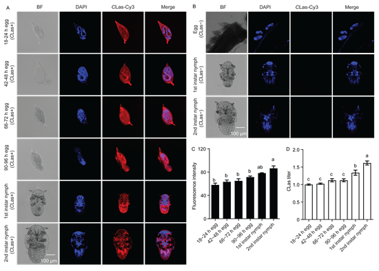黄龙病菌在柑橘木虱卵及低龄若虫体内的分布及滴度变化