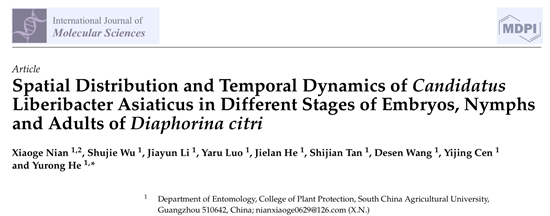 以上结果在期刊International Journal of Molecular Science (影响因子6.2,中科院2区) 上发表了题为“Spatial distribution and temporal dynamics of Candidatus Liberibacter Asiaticus in different stages of embryos, nymphs and adults of Diaphorina citri”(https://www.ncbi.nlm.nih.gov/pmc/articles/PMC10219130/)的论文。博士后念晓歌为该论文的第一作者,何余容教授为该论文的通讯作者,岑伊静和王德森副教授参与了该项研究。该论文得到国家自然科学基金青年基金(32102193)、“十四五”广东省农业科技创新十大主攻方向“揭榜挂帅”项目(2022SDZG07)的资助。