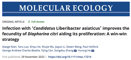 以上结果在期刊Molecular Ecology(影响因子5.6;中科院1区)上发表了题为“Infection with‘Candidatus Liberibacter asiaticus’improves the fecundity of Diaphorina citri aiding its proliferation: a win-win strategy”(https://pubmed.ncbi.nlm.nih.gov/38018658/)的论文。博士后念晓歌为该论文的第一作者,何余容教授和中国农业大学昆虫学系张松斗副教授为该论文的共同通讯作者,岑伊静副教授、王德森副教授、澳大利亚西悉尼大学Paul Holford教授和George Andrew Charles Beattie教授参与了该项研究。该论文得到国家自然科学基金青年基金(32102193)、“十四五”广东省农业科技创新十大主攻方向“揭榜挂帅”项目(2022SDZG07)的资助。