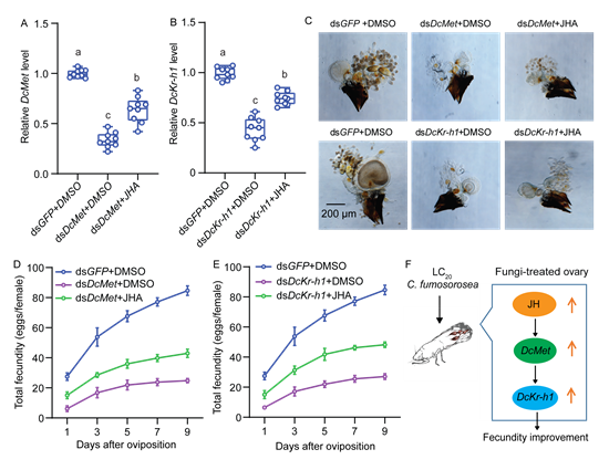 以上结果在期刊Entomologia Generalis(影响因子5.2;昆虫学1区)上发表了题为“Methoprene-tolerant and Krüppel-homologue 1 are involved in the fecundity improvement of Diaphorina citri induced by Cordyceps fumosorosea”(DOI: 10.1127/entomologia/2023/2101)的论文。硕士生武书杰为该论文的第一作者,何余容教授和博士后念晓歌为该论文的共同通讯作者,岑伊静副教授、王德森副教授参与了该项研究。该论文得到国家自然科学基金青年基金(32102193)、“十四五”广东省农业科技创新十大主攻方向“揭榜挂帅”项目(2022SDZG07)的资助。