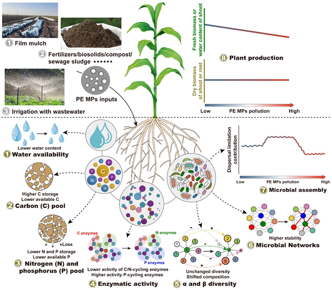该论文利用中宇宙受控实验,揭示了土壤微塑料污染对作物-土壤系统多功能性的影响效应。结果显示,微塑料会降低土壤水分和养分的有效性,影响土壤微生物群落组装和结构、碳氮磷循环相关酶的活性以及生态系统多功能性。但生态系统多功能性对微塑料污染的响应与其微塑料浓度相关。高浓度的微塑料污染会降低农田生态系统多功能性。因此,研发和实施可行的土壤微塑料污染防控技术和可操作性方案对农业安全生产和生态安全至关重要。