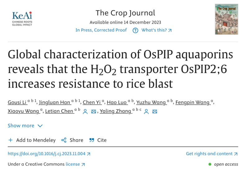 近日,乐竞在线注册陈乐天课题组在The Crop Journal在线发表了题为“Global characterization of OsPIP aquaporins reveals that the H2O2 transporter OsPIP2;6 increases resistance to rice blast”的研究论文,作者分析了水稻(Oryza sativa)中11个OsPIPs的表达模式、亚细胞定位和H2O2转运能力,并以此锁定了水稻抗病重要蛋白OsPIP2;6,进而揭示其与OsPIP2;2形成转运复合体协同防御病原体的分子机制。