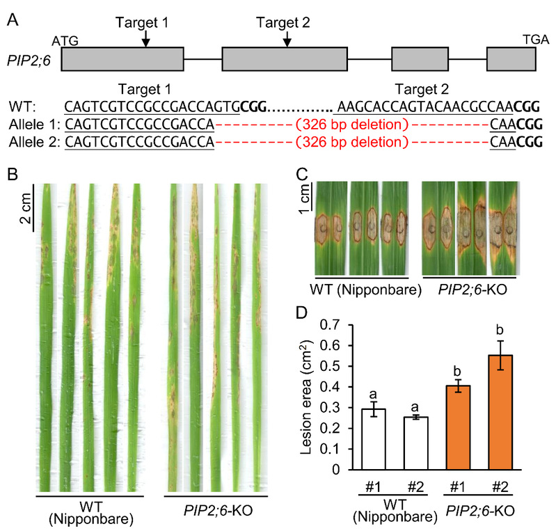 图2 敲除OsPIP2;6增加水稻对M. oryzae的感病性
