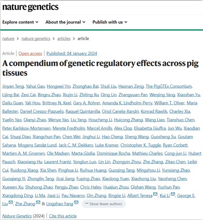 近日,猪禽种业全国重点实验室、国家生猪种业工程技术研究中心、广东省农业动物基因组学与分子育种重点实验室,乐竞在线注册动物科学学院张哲/李加琪教授团队与国内外多个团队合作在猪基因组学领域取得重要进展。由乐竞在线注册与丹麦奥胡斯大学、英国爱丁堡大学、美国农业部农业研究局(USDA-ARS)和中国农科院深圳基因组研究所等全球10个国家的50余个研究团队合作完成的PigGTEx项目研究论文“A compendium of genetic regulatory effects across pig tissues”(猪多组织遗传调控效应图谱)于2024年1月4日在线发表于国际顶级期刊《自然—遗传学》(Nature Genetics)。这是全球猪基因组学研究领域时隔8年再次登上《自然—遗传学》的研究成果,同时也是我国猪遗传育种领域第3篇发表于该刊物的论文。
