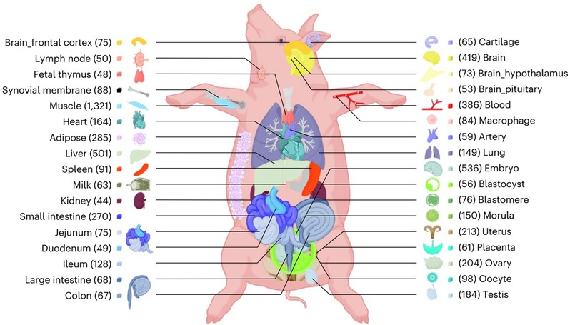 这项研究中,研究团队整理出猪迄今最大规模的转录组大数据集,构建了多组织基因表达谱。研究人员从公共数据库中收集了来自全球100多个猪品种的所有转录组数据和其它多组学数据(scRNA-Seq、WGS、WGBS和Hi-C等),涵盖了138种组织/细胞类型,获得了7,095个高质量的RNA-Seq样本的5种转录本(蛋白编码基因、可变剪接、lncRNA、外显子和增强子)的2,292,954个分子表型。基于此,项目组深入解析了猪多组织基因表达模式,鉴定出34个代表性组织的特异表达基因。本研究构建的猪多组织基因表达图谱,为完善猪基因组功能注释提供了极为丰富的数据资源。