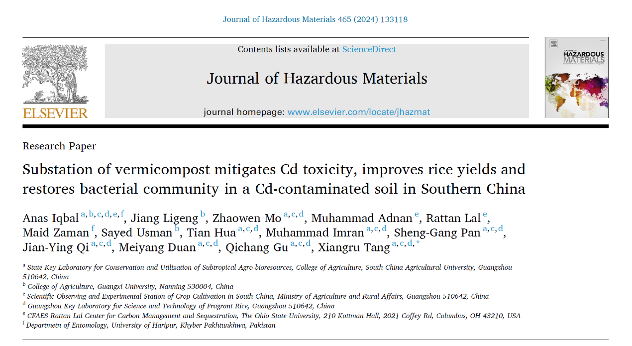 近日,乐竞在线注册农学院唐湘如教授团队在环境科学与生态学领域国际著名期刊Journal of Hazardous Materials(中科院一区,影响因子13.6)上在线发表了题为“Substation of vermicompost mitigates Cd toxicity, improves rice yields and restores bacterial community in a Cd-contaminated soil in Southern China”的研究论文。