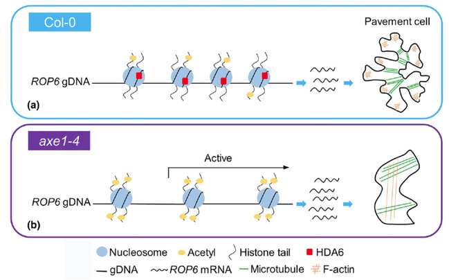 植物叶表皮扁平细胞作为研究植物界细胞极性建立与形态发生复杂性的典型模型系统,呈现出如拼图般的形态特征。这种扁平细胞的镶嵌模式赋予了细胞抗拉伸的机械强度,从而维持叶表面结构的完整性和提供适应外界环境的能力。在植物发育过程中,与Rho相关的GTP分子开关(ROPs)及其下游信号通路对细胞极性的形成与维系发挥关键的生物学功能,但是对ROP的转录调控机制一直都尚未被研究和解析。本研究深入研究了组蛋白去乙酰酶HDA6如何通过表观遗传机制调控ROP6的转录,并进一步影响拟南芥叶表皮细胞的细胞极性形成和细胞形态发生。研究发现,HDA6突变体axe1-4出现了叶片卷曲和叶表皮细胞细胞极性丧失的情况。进一步细胞学研究发现,其与细胞骨架微丝和微管的空间分布与结构改变有关,它们是决定叶表皮细胞极性形成的关键因素。接下来通过转录分析和染色质免疫沉淀分析,发现HDA6通过组蛋白H3k9k14去乙酰化特异性地抑制ROP6的表达。更重要的是,显性负性效应rop6的过表达在axe1-4突变体中恢复了拼图状的细胞形态。本研究揭示了HDA6通过表观遗传抑制ROP6的转录来调控拟南芥叶表皮细胞极性建立和维系以及叶片形态发生中的关键作用。它揭示了HDA6在ROP6转录调控中的重要地位,并为组蛋白去乙酰化HDA6和ROP6介导的细胞骨架空间分布在叶表皮细胞发育中的功能和相互作用提供了有力的证据。