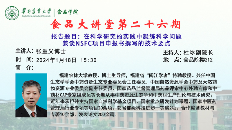 食品大讲堂第二十六期:在科学研究的实践中凝练科学问题兼谈NSFC项目申报书撰写的技术要点