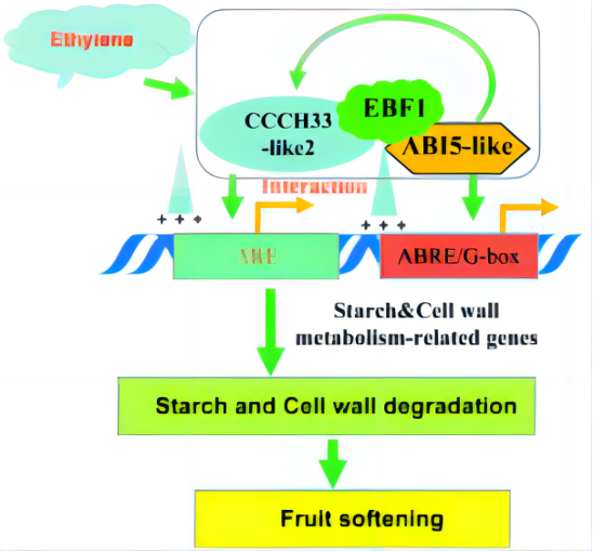 课题组前期的研究发现,粉蕉MaEBF1通过与MaNAC67-like、MaABI5-like、MaBEL1和MaC2H2-like互作,促进果实淀粉和细胞壁降解,进而调控果实成熟过程,并参与调控果实后熟障碍。但是,锌指转录因子调控果实成熟相关研究尚未见报道。本研究发现粉蕉MaCCCH33-like2的基因和蛋白表达与果实成熟密切相关。MaCCCH33-like2正调控1个淀粉降解基因(MaISA2)和2个细胞壁降解基因(MaSUR14-like和MaXYL32),MaEBF1与MaCCCH33-like2蛋白互作增强MaCCCH33-like2对淀粉和细胞壁降解基因的调控。同时MaABI5-like与MaCCCH33-like2蛋白互作增强MaCCCH33-like2和MaABI5-like对淀粉和细胞壁降解基因的调控。MaCCCH33-like2粉蕉瞬时超表达和番茄异源超表达都显著促进果实的成熟及淀粉和细胞壁降解基因的表达,而MaCCCH33-like2粉蕉瞬时沉默抑制果实成熟及淀粉和细胞壁降解基因的表达。同时发现MaABI5-like位于MaCCCH33-like2上游,调控其表达。