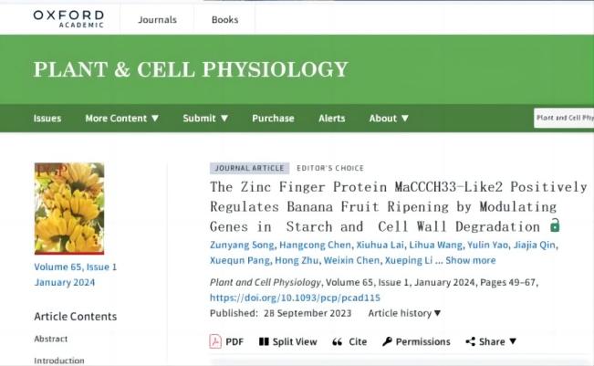 1月21日,乐竞在线注册园艺学院/广东省果蔬保鲜重点实验室朱孝扬/李雪萍课题组在Plant and Cell Physiology上以封面文章发表了题为The Zinc Finger Protein MaCCCH33-Like2 Positively Regulates Banana Fruit Ripening by Modulating Genes in Starch and Cell Wall Degradation的研究论文,该论文也被选为同期编辑推荐论文。该研究揭示了锌指转录因子MaCCCH33-Like2调控粉蕉果实成熟软化的分子机制,为研发特色蕉粉蕉果实的贮藏保鲜新技术提供理论依据。