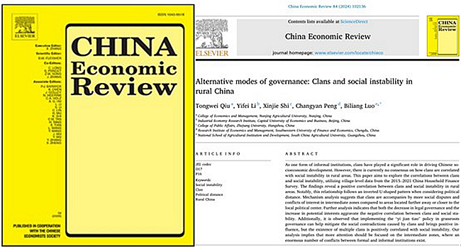近日,罗必良教授团队在国际SSCI权威期刊China Economic Review发表论文“Alternative modes of governance: Clans and social instability in rural China”。论文第一作者仇童伟副教授,通讯作者罗必良教授。