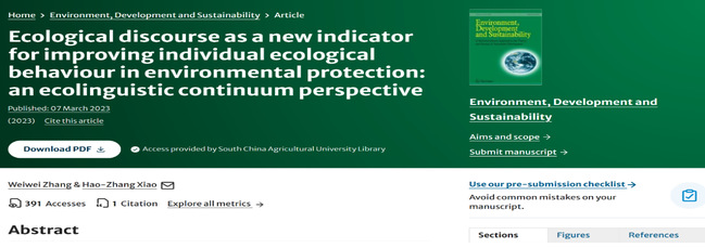 研究从肖好章教授提出的生态语言学连续统理论视角,探讨了生态话语作为改善个体生态行为的新指标在环境保护中的重要作用,为提升公众环保意识和行为提供了新的思路和方法。相关成果发表在Environment, Development and Sustainability,题目为“Ecological discourse as a new indicator for improving individual ecological behaviour in environmental protection: an ecolinguistic continuum perspective”。该论文第一作者为博士生张薇薇,通讯作者为肖好章教授。