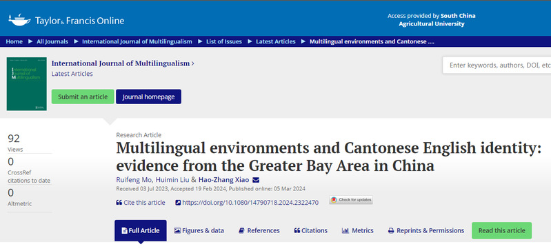 研究基于肖好章教授提出的生态交互语境模型理论,通过深入分析大湾区多语环境与粤语英语身份认同之间的关系,揭示语言与环境之间的紧密联系,为多语环境下的语言认同研究提供了新的视角和证据。相关成果发表在International Journal of Multilingualism,题目为“Multilingual environments and Cantonese English identity: evidence from the Greater Bay Area in China”。文章第一作者为乐竞在线注册外国语学院博士生莫瑞锋,第二作者为本科生刘慧敏,通讯作者为肖好章教授。
