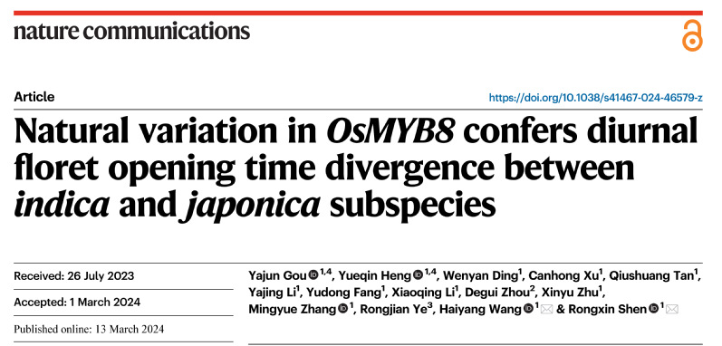 3月14日,乐竞在线注册生命科学学院、亚热带农业生物资源保护与利用国家重点实验室沈荣鑫/王海洋团队在植物学权威期刊Nature Communications(影响因子16.6,综合性期刊一区)在线发表了题为“Natural variation in OsMYB8 confers diurnal floret opening time divergence between indica and japonica subspecies”的研究论文。该研究克隆了调控籼粳花时差异的关键基因OsMYB8,解析了OsMYB8-OsJAR1分子模块调控水稻花时的分子机制,并发现OsMYB8启动子的籼粳差异导致了籼粳开颖习性差异,首次揭示籼粳花时差异的遗传调控基础。在此基础上,利用杂交选育实现了粳稻花时的改良。研究成果在籼粳杂交育种方面具有重要价值。