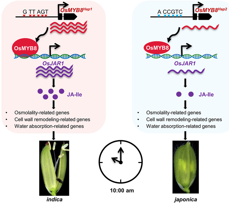 浆片是位于水稻颖花内外稃和子房之间的一对形似肺状的特殊花器官,是控制颖花开闭最关键的结构。浆片吸水膨大推开内外稃,颖花开放;浆片失水萎缩使得内外稃重合,颖花闭合。籼稻TFB花时较粳稻ZH11早1-2h,其浆片吸水膨胀达到最大体积的时间较ZH11提前。通过对TFB和ZH11开花过程中不同时间点的浆片进行比较转录组分析,成功筛选到一个在籼粳浆片中差异表达的R2R3-MYB转录因子OsMYB8。OsMYB8在开花前1h的浆片中表达量最高,且在TFB中提前高表达。通过CRISPR-Cas9技术分别创制了ZH11背景(Osmyb8ZH)和TFB背景(Osmyb8TF)的Osmyb8突变体,Osmyb8突变体花时较野生型均延迟0.5-1h。提高ZH11浆片中的OsMYB8表达量可以使花时提前0.5-1h。利用OsMYB8的DAP-seq中直接结合的基因和Osmyb8突变体浆片RNA-seq中的显著差异基因进行重叠分析,筛选到OsMYB8的下游靶基因OsJAR1,其编码一个茉莉酸氨基酸合成酶,能够将JA与Ile结合生成有活性的茉莉酸类物质JA-Ile。OsMYB8可以直接结合OsJAR1的启动子并诱导其表达,影响浆片中JA-Ile的含量,从而调控影响细胞渗透压和细胞壁结构相关基因的表达,促进浆片吸水膨胀。在籼稻和粳稻的OsMYB8启动子上存在6个SNPs,导致籼型OsMYB8启动子活性较粳型更强,携带籼型OsMYB8的水稻开花前浆片中OsMYB8的表达水平和JA-Ile含量更高,花时更早。将TFB的OsMYB8导入至Osmyb8ZH突变体中,可以使其花时较ZH11提前0.5h。携带籼稻OsMYB8的近等基因系NILTFB和染色体片段代换系CSSL9311均较粳稻亲本早开花0.5h,且对水稻的生长和产量无明显负面影响。该研究首次揭示籼粳稻每日开花时间差异的遗传基础和演化规律,并为改良水稻花时提供了有效的基因资源,有助于推动籼粳杂交育种的发展。