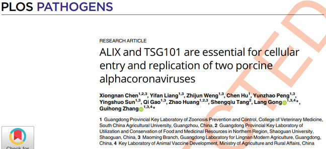 近日,乐竞在线注册兽医学院张桂红/龚浪课题组在中科院一区病毒学权威杂志PLOS Pathogens(影响因子6.7)在线发表题为“ALIX and TSG101 are essential for cellular entry and replication of two porcine alphacoronaviruses”的文章,研究揭示了ESCRT系统关键蛋白ALIX和TSG101是两种猪冠状病毒侵染过程中必需的宿主因子,并在病毒内吞、溶酶体运输和病毒复制室形成的不同步骤发挥重要作用。