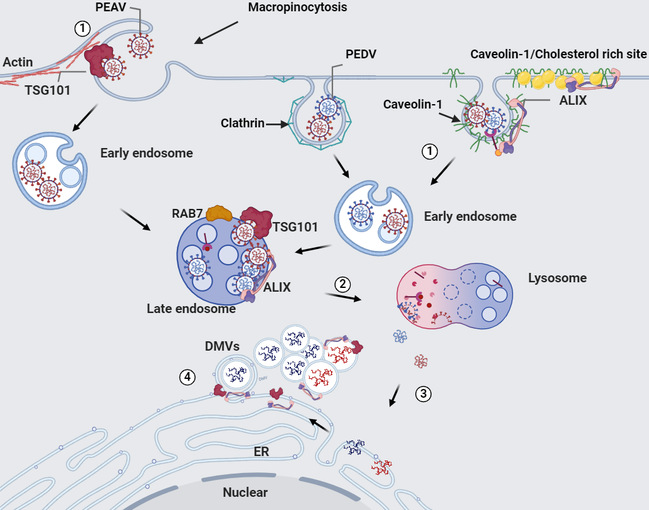 在本研究中,我们评估了内吞分选转运复合体(ESCRT)系统关键蛋白ALIX和TSG101在两种猪α冠状病毒(PEDV和PEAV)生命周期中的作用,尤其是病毒入侵和复制过程。结果表明,沉默ALIX或TSG101的表达,PEDV和PEAV感染宿主细胞水平显著降低。此外,PEDV的内化增加了ALIX与小窝蛋白(CAV1)和RAB7的相互作用,而CAV1和RAB7对PEDV内吞和溶酶体运输至关重要,但TSG101对于PEDV内化和溶酶体运输步骤不是必须的。有趣的是,PEAV不仅依赖ALIX调节CAV1介导的内吞步骤和溶酶体运输过程,还需要TSG101调节巨胞饮内吞过程。此外,PEDV和PEAV基因组进入内质网中的病毒复制位点后,ALIX和TSG101将被招募到PEDV和PEAV的复制位点,透射电镜超微结构显示ALIX和TSG101在内质网和病毒诱导的双膜囊泡(DMVs)中富集。这说明ALIX和TSG101除了参与猪α冠状病毒内吞和溶酶体运输过程,还与病毒复制阶段密切相关,尤其是病毒双膜囊泡的形成过程。总的来说,这些数据突出了ALIX和TSG101在两种猪α冠状病毒入侵和复制中的双重作用。图中描述了PEDV和PEAV入侵和复制过程,以及ALIX和TSG101在病毒入侵和复制过程所发挥的作用。