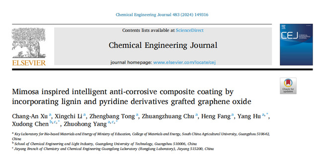 涂层虽然能有效防止金属腐蚀,但在固化过程易形成微孔和微裂纹,并且涂层使用不可避免地受到外界环境破坏,导致其防护能力不足,从而缩短金属材料寿命。受含羞草应激闭合自我保护机制启发,利用三联吡啶单体和木质素接枝的氧化石墨烯制备了一种对腐蚀产物亚铁离子具有智能防腐功能的涂层。此工作不仅赋予涂层自修复性能,延长金属使用寿命,而且还拓展了生物质材料木质素在防腐领域的应用。此研究成果发表于Chemical Engineering Journal,题目为“Mimosa inspired intelligent anti-corrosive composite coating by incorporating lignin and pyridine derivatives grafted graphene oxide”。文章第一作者为博士后徐长安, 通讯作者为杨卓鸿教授、陈旭东教授和胡洋副教授。