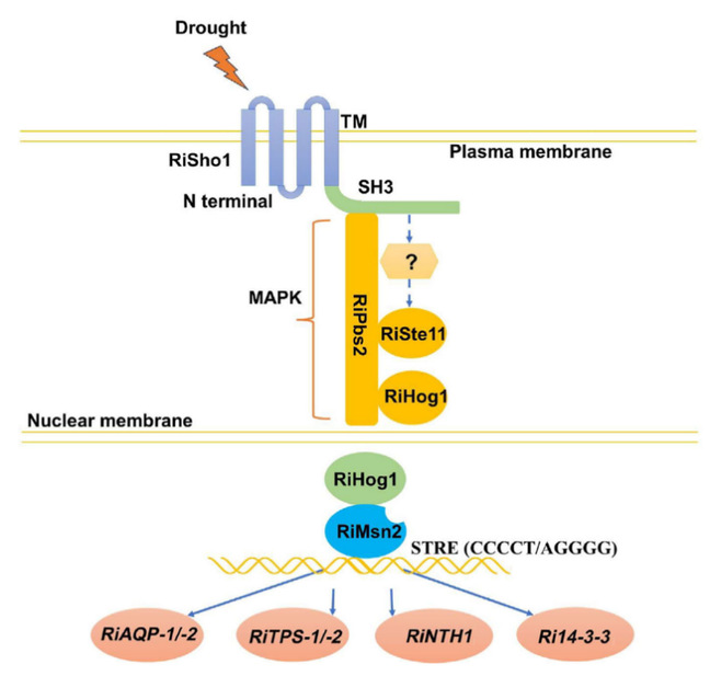 AM真菌Sho1-MAPK途径调控植物耐旱分子机制的模式图