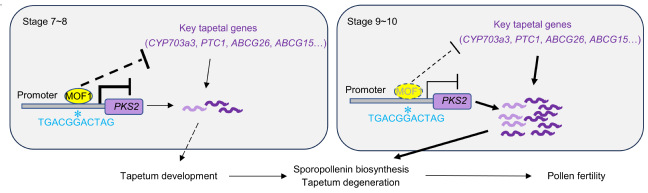 本研究中,作者仔细验证并研究了二倍体和四倍体水稻中MOF1突变引起的雄性不育现象。MOF1突变导致花药绒毡层和中层延迟降解,以及异常花粉壁形成。利用EAT1启动子,使MOF1特异的在花药发育后期的绒毡层中延迟表达,结果导致绒毡层发育异常和严重的花粉败育,表明精确控制MOF1的表达对雄性育性至关重要。另外,发现五个关键的绒毡层基因(CYP703A3、OsABCG26、PTC1、PKS2和OsABCG15)表现出与MOF1互补的表达模式,并在mof1突变体花药中上调表达。异位表达的MOF1株系中,PKS2的转录受到明显抑制。PKS2编码一个花粉外壁形成所需的关键酶--聚酮合酶,对育性至关重要(Zhu et al., 2017; Zou et al., 2018)。作者进一步利用DAP-seq、EMSA和荧光素酶报告系统证实MOF1直接结合PKS2启动子的Motif2,并抑制其转录。