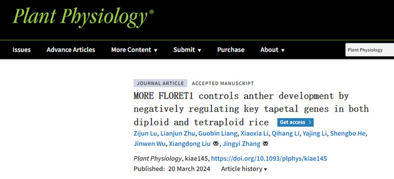 近日,乐竞在线注册农学院赫圣博团队与刘向东团队合作在国际知名期刊Plant Physiology发表题为“MORE FLORET1 controls anther development by negatively regulating key tapetal genes in both diploid and tetraploid rice”的研究论文,阐明了转录因子MOF1的精准表达对绒毡层发育至关重要,并揭示了MOF1调控绒毡层发育和花粉育性的分子机理,为开发不同倍性水稻(包括二倍体和四倍体水稻)雄性不育系提供理论参考和基因资源。