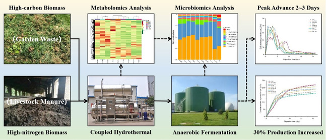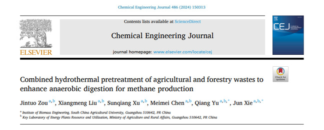 针对种养废弃物性质差异大,天然结构致密,厌氧消化效率低的问题,研究团队发明了共水热预处理耦合厌氧发酵(CHTP-AD)技术,可显著提高废弃物的厌氧消化效率及沼气产量。团队采用高碳生物质与富氮生物质作为反应底物,探索了具有显著理化特性差异的生物质共水解过程有机质析出与解聚特性,获得了最优的产甲烷工艺。还对生物质水解产物、甲烷转化路径、微生物生化转化效率及厌氧系统稳定性做了研究,进一步阐明水热预处理促进厌氧发酵的协同机制,为农林废弃物资源化能源化转化提供了理论和技术支撑。此研究成果发表在Chemical Engineering Journal (工程技术一区,Top,影响因子15.1)上,题目为“Combined hydrothermal pretreatment of agricultural and forestry wastes to enhance anaerobic digestion for methane production”,文章第一作者为博士生邹金拓, 通讯作者为谢君教授和余强研究员。