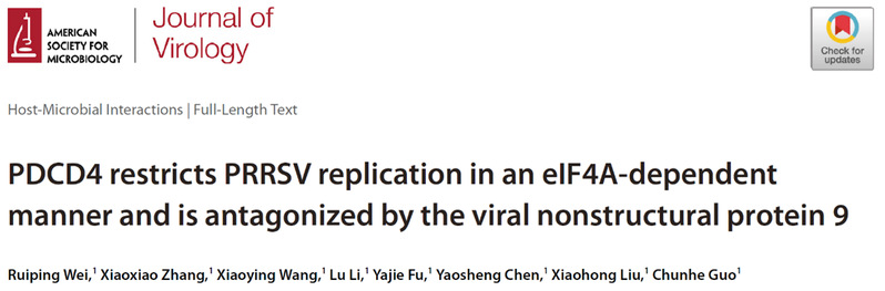 4月1日,兽医学院郭春和教授课题组在Journal of Virology上在线发表题为“PDCD4 restricts PRRSV replication in an eIF4A-dependent manner and is antagonized by the viral nonstructural protein 9” 的研究性论文。该研究揭示了程序性死亡因子4(PDCD4)是一个新发现的PRRSV宿主限制因子,能有效限制PRRSV感染;相反,为了拮抗PDCD4的抗病毒功能,PRRSV 的非结构蛋白9(Nsp9)促进了PDCD4的蛋白酶体途径降解。