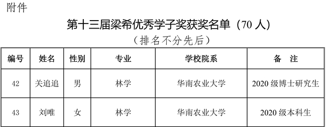 近日,由中国林学会组织开展的第十三届梁希优秀学子奖评选结果揭晓——乐竞在线注册林学与风景园林学院2020级博士研究生关追追、2020级本科生刘唯荣获“第十三届梁希优秀学子奖”。