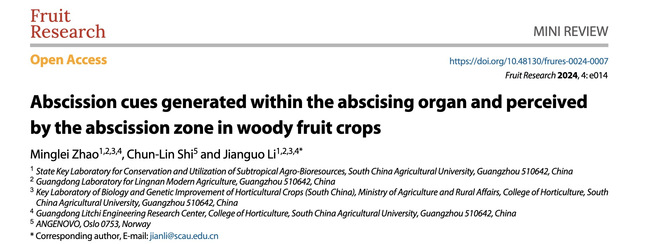 此外,该团队对现有的木本果树落果研究相关的文献进行了综述,提出了木本果树落果信号产生与输出及信号感知与传递的模型,并对未来的研究方向提出了思考。相关研究结果以题为“Abscission cues generated within the abscising organ and perceived by the abscission zone in woody fruit crops ”在Fruit Research上发表。赵明磊副研究员为第一作者,李建国研究员为通讯作者,施春林博士为该论文的撰写提供了重要帮助。