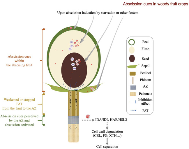 图3. 木本果树中果实脱落信号的产生、传导和感知模型