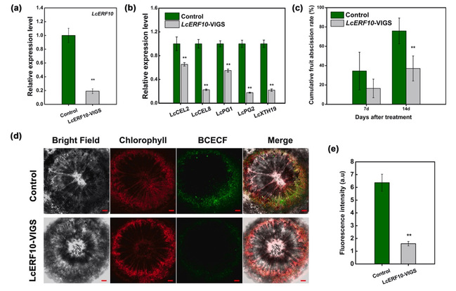 图2. VIGS介导的LcERF10基因沉默抑制离区细胞质碱性化,降低荔枝落果。