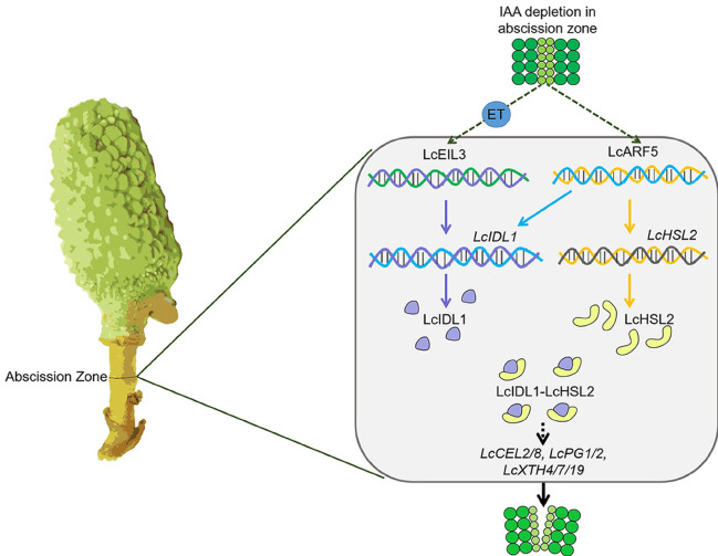图1. LcARF5/LcEIL3-LcID1/LcHSL2转录调控模块介导乙烯和生长素交互调控荔枝落果的模型