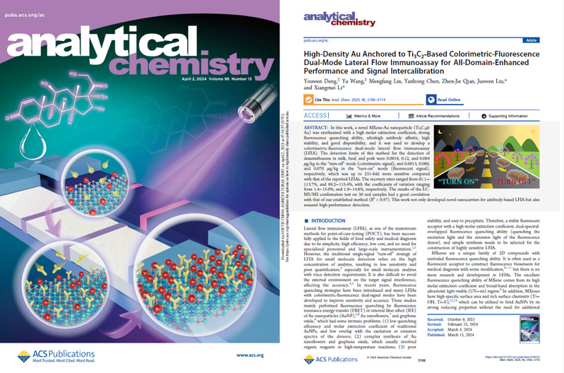 近日,乐竞在线注册食品安全与营养团队在分析化学领域国际权威期刊Analytical Chemistry以Supplementary Cover形式在线发表了题为“High-Density Au Anchored to Ti3C2-Based Colorimetric-Fluorescence Dual-Mode Lateral Flow Immunoassay for All-Domain-Enhanced Performance and Signal Intercalibration”的文章。