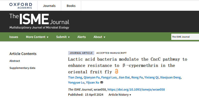 4月15日,植物保护学院许益镌教授课题组在ISME Journal在线发表了一项最新研究成果,题为“Lactic Acid Bacteria Modulate the CncC Pathway to Enhance Resistance to β-cypermethrin in the Oriental Fruit Fly”。该研究首次深入揭示了昆虫肠道共生菌如何通过间接方式调控宿主桔小实蝇的解毒功能,进而增强其抗药性。这一成果是继该团队于2017年在Microbiome上发表关于肠道共生菌通过直接代谢敌百虫提升实蝇抗药性的文章后,在昆虫抗药性研究领域取得的又一重要发现,为理解宿主与微生物的相互作用提供了新的视角。