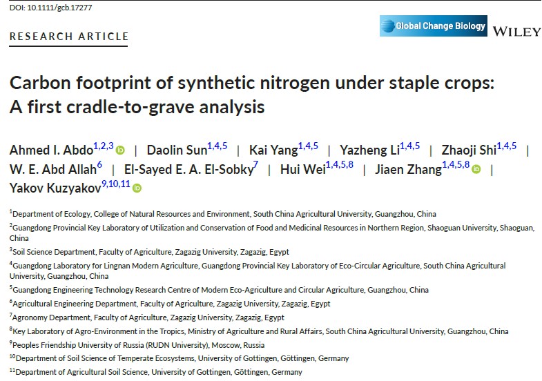 随着全球人口和粮食需求的持续增加,化肥施用成为保障农作物产量和全球粮食安全的重要手段。水稻、小麦和玉米种植占全球47%的农用地面积,其氮肥用量高达52.5TgN,达到全球农业氮肥用量的一半以上。然而,关于全球尺度上农田氮肥投入的碳足迹定量分析仍然缺乏,导致农业氮肥投入的温室效应尚不清楚。为此,章家恩教授团队通过全球数据整合,对上述三种主要农作物生产过程的氮肥投入开展全过程生命周期评估,定量分析农作物氮肥投入的碳足迹。近日,相关成果以“Carbon footprint of synthetic nitrogen under staple crops: A first cradle-to-grave analysis”为题发表于国际生态环境领域顶级期刊Global Change Biology(中科院一区TOP期刊,影响因子11.6)。