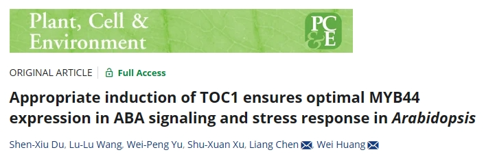 近日,生命科学学院黄巍教授团队在Plant Cell and Environment(中科院一区Top,影响因子7.3)发表题为Appropriate induction of TOC1 ensures optimal MYB44 expression in ABA signaling and stress response in Arabidopsis的研究论文。
