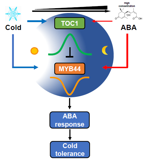 本研究揭示了拟南芥生物钟核心振荡器TOC1通过抑制MYB44基因调控ABA信号通路以及冷胁迫响应的机制。团队对拟南芥生物钟基因TOC1的RNA-Seq、ChIP-Seq数据进行生物信息学分析,寻找到TOC1的直接下游基因MYB44,证实了MYB44具有节律性并且受到TOC1调控。此外,研究还发现TOC1和MYB44能通过ABA依赖及ABA非依赖的方式响应冷胁迫,以确保对各种胁迫做出适当的反应,并在正常生理过程和能量消耗的胁迫反应之间保持平衡。此项研究首次发现了拟南芥的生物钟核心振荡器TOC1接近ABA最上游的调控通路,在揭示拟南芥生物钟对ABA信号与冷胁迫的调控途径同时,为优质抗冷作物育种提供了新思路,为连接生物钟、ABA信号和胁迫响应基因的调控网络提供了深入的见解。