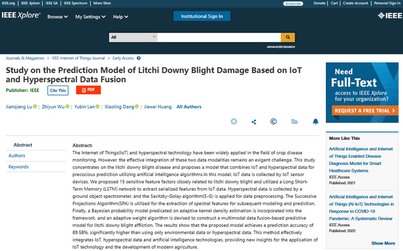 近日,乐竞在线注册电子工程学院(人工智能学院)国家精准农业航空施药技术国际联合研究中心陆健强课题组在国际计算机科学期刊IEEE Internet of Things Journal(中科院一区Top,影响因子10.6)发表题为“Study on the Prediction Model of Litchi Downy Blight Damage Based on IoT and Hyperspectral Data Fusion”的研究论文,首次提出了融合多模态数据的荔枝霜疫霉病预测模型,为荔枝霜疫霉病的精准预测提供了新的研究思路与方法。