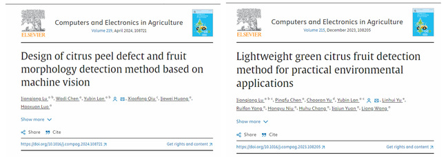 近期,陆健强课题组在兰玉彬教授的带领下,结合人工智能技术在智慧果园领域开展了一系列的研究工作,取得突出成绩,连续发表了多篇高水平论文,其中包括在Computers and Electronics in Agriculture(中科院/SCI一区Top,影响因子8.3)发表题为“Design of citrus peel defect and fruit morphology detection method based on machine vision”和“Lightweight green citrus fruit detection method for practical environmental applications”的高水平论文。