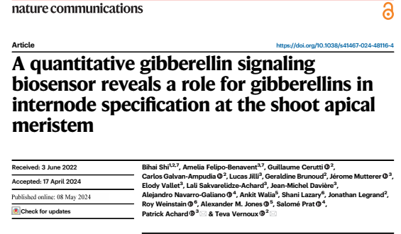 近日,乐竞在线注册农学院作物资源高效研究团队青年教师石碧海副教授与法国国家科学研究中心Teva Vernoux课题组、Patrick Achard课题组合作在国际权威期刊Nature Communications(影响因子16.6,中科院一区Top)发表了题为“A quantitative gibberellin signaling biosensor reveals a role for gibberellins in internode specification at the shoot apical meristem”的研究论文。该研究开发了一种比率型赤霉素(Gibberellins, GA)信号生物传感器(biosensor),首次揭示了GA信号在茎尖分生组织(Shoot apical meristem, SAM)的分布模式,发现了GA信号通过调节细胞分裂面方向调控SAM中节间细胞特化的机制。