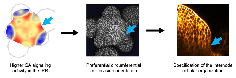 该研究首先开发了一种比率型GA信号生物传感器qmRGA,qmRGA通过定量映射由GA及其受体浓度的协同作用产生的GA信号活性,提供了细胞水平上GA功能的信息。通过生化和体内荧光蛋白定量等手段,进一步证明了qmRGA在下胚轴和SAM等组织器官中能够对外源和内源GA变化作出响应。为探索GA信号在SAM生长过程中的可能作用,研究人员利用qmRGA对SAM中GA信号分布进行定量分析,绘制了茎尖生长点SAM中的GA信号活性分布图,发现高强度GA信号主要存在于器官原基间区域(inter-primordia-region, IPR)的细胞中。通过对GA信号活性与细胞扩张和细胞分裂进行关联分析,发现GA信号活性与IPR细胞分裂面横向分布相关。进一步分析GA信号增强突变体global della和quad della、GA合成缺陷突变体quad ga2ox以及GA信号区域特异减弱植株pCUC2::gai-VENUS在SAM上IPR和非IPR区域的细胞分裂方向的变化情况,证明了GA信号调控细胞分裂面的方向。时间点活体成像跟踪上述遗传材料中IPR细胞的组织方式和发育变化,揭示了IPR细胞的分裂模式确实预先组织细胞成放射状排列,就像在节间中一样。这种放射状的组织方式以及IPR细胞位于器官原基之间的定位,表明这些细胞是节间前体细胞。最后,作者在上述材料中观察到植物节间长度的相应变化。因此,以上结果支持了这样的假设:在IPR中较高的GA信号活性通过调节细胞分裂面的方向,特化了茎尖生长点SAM中节间的细胞组织结构。该研究为进一步深入理解GA在SAM中的作用提供了新的见解。