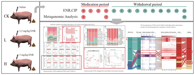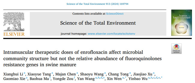 课题组在国际著名学术期刊Science of the Total Environment上发表了题为“Intramuscular therapeutic doses of enrofloxacin affect microbial community structure but not the relative abundance of fluoroquinolones resistance genes in swine manure”,发现生猪肌注治疗剂量的恩诺沙星后,在用药期结束时猪粪中的恩诺沙星和及其代谢产物环丙沙星的浓度达到最高,猪粪中的多重耐药类ARGs的占优势,Clostridium 和 Lactobacillus是肌注恩诺沙星后猪粪中ARGs主要宿主细菌。本研究为科学评估生猪治疗用药条件下的粪污抗性污染风险提供数据参考。文章第一作者为2021级硕士研究生李香会,通讯作者为吴银宝教授和温馨博士。